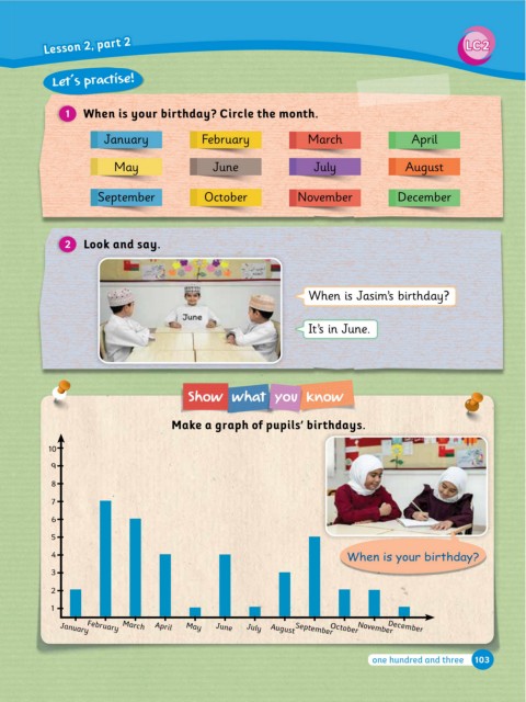 December 1 August January November When is your birthday? Important months January September February Look and say. When is your birthday? Circle the month. 1 2 Let’s practise! 1 2 3 4 5 6 7 8 9 10 Lesson 2, part 2 Lesson 2, part 1 10 2 Look and say. Make a graph of pupils’ birthdays. Look, lis December 1 LC2 Learning Club