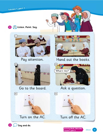 Lesson 1, part 1 Pay attention. Turn on the AC. Say and do. Listen. Point. Say. 1 5 3 W.2 4 3 Lesson 1, part 1 Lesson 1, part 1 Tidy up. 2 6 4 Put away your pencil. 6 Hand out the boo�s. Hold up your drawing. Turn o�� the AC. a�e out your pencil. As� a question. Put up your hand. Lesson 1, part 2 Back to school eleven ten Listen. Point. Say. 1 T 5 3 W.1 11 10 2 1 Welcome