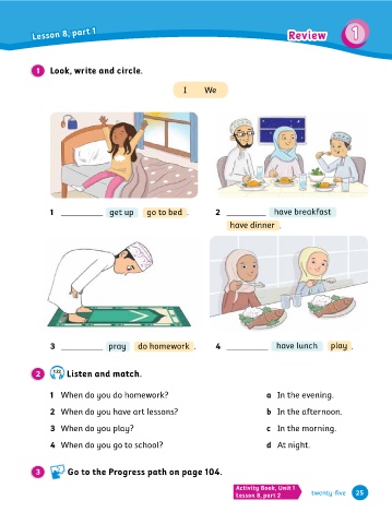 Phonics elephant Review Review have lunch have breakfast d At night. c In the morning. b In the afternoon. a In the evening. wheel abet wh I We 4 ph phone ph ele ite ant 1.22 4 When do you go to school? 3 When do you play? 2 When do you have art lessons? 1 When do you do homework? 3 1 Look, write and circle. 1 3 2 Lesson 8, part 1 Lesson 7, part 1 Lesson 8, part 1 Lesson 7, part 1 3 4 When do you go to school? ph 4 2 I