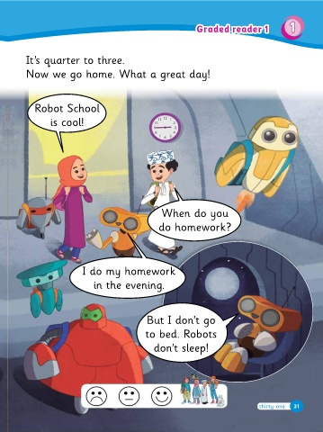 30 31 When do you Graded reader 1 Wow! I li�e the in the evening. I do my homewor� is cool! Robot School Now we go home. What a great day! It’s quarter to three. Now we go home. What a great day!s a sports car! to bed. Robots in the a�ternoon. We have art lessons thirty-one thirty 1 Graded reader 1 31 30 31 30 31 30 31 30 When do you GR1.1 Robot’s drawing. It’ It’s hal� past one. This is the art classroom. Loo� at have art lessons?