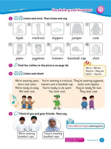 36 37 1 2 thirty-six thirty-seven thirty-seven 5 10 We’re – We are You’re – You are They’re – They are Let’s dress up! pyjamas trac�suit 2 7 Listen and chant. Listen and stick. Then listen and say. 2.4 2.2 Think of you and your friends. Then say. We loo� cool. baseball caps. We’re wearing shirts and coats. Find the clothes in the picture on page 36. jeans hijab 2.1 We’re ready to play. We’re wearing jeans, You’re wearing a trac�suit, Th