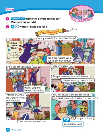 Story 2 4 Where are the parrots? Ar Lesson 2, part 2 Activity Book, Unit 2 The school show And these shirts! What can we do? Lesson 2, part 1 I’ve got an idea! Helpers Team Well done, everyone! Can we recycle these pyjamas, too? 2 1 4 2 1 Atomic and Polly and jumpers! are wearing coats