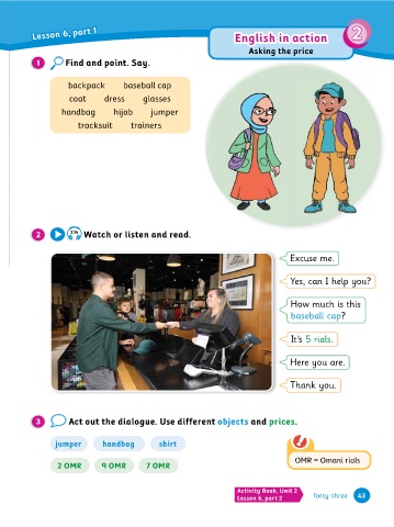 2 CULTURE OMR = Omani rials It’s 5 rials. baseball cap? How much is this Than� you. Here you are. Yes, can I help you? Excuse me. Let’s look at Eid Al-Fitr. shirt Eid Al-Fitr. traditional clothes 1 3 2 Lesson 6, part 1 Lesson 6, part 1 Lesson 6, part 1 9 OMR 7 OMR It’s a�ter Ramadan. This is the �estival �or Eid Al-Fitr. English in action o w t Find out more! Watch the video. Listen and read. Write. This is … They’re wearing … part 1