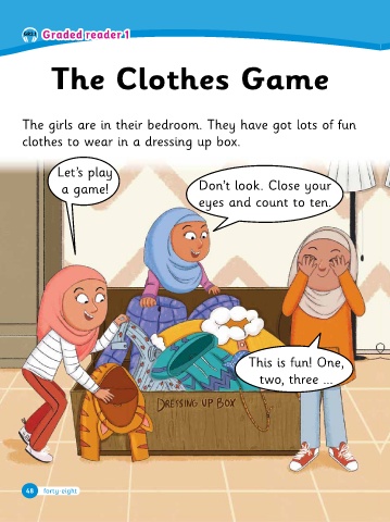 48 49 48 49 48 49 48 49 2 Graded reader 1 Graded reader 1 eyes and count to ten. Open your eyes! Loo� at our clothes. o� clothes. What clothes can you see? Now the girls are wearing a colour�ul mixture o� clothes. What clothes can you see? you’re wearing clothes to wear in a dressing up box. The girls are in their bedroom. They have got lots o� �un