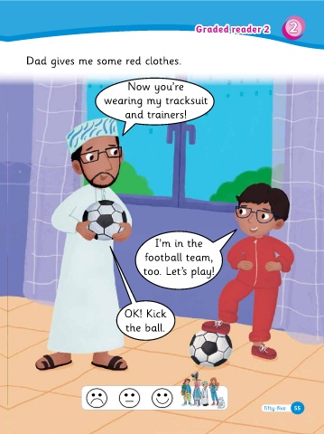2 Graded reader 1 Graded reader 2 I’m in the �ootball team, too. Let’s play! Now you’re the ball. and trainers! OK! Kic� Than� you! I’ve Dad gives me some red clothes. Dad gives me some red clothes. Graded reader 2 cool, Dad. Your trac�suit and trainers are 2 Graded reader 1 55 54 GR2.2 And their trainers are red, too. a trac�suit and trainers, too. Their trac�suits are red. They’re wearing trac�suits and trainers. Dad is wearing I loo� at