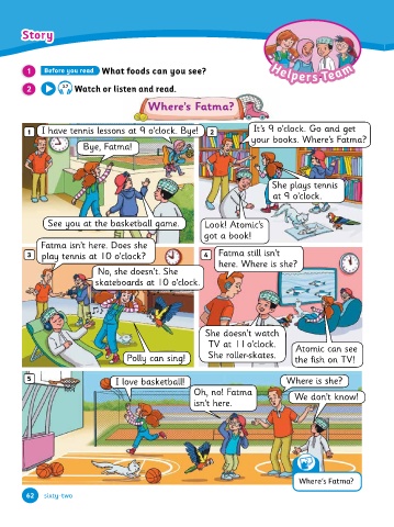 Story 3 5 Fatma isn’t here. Does she Where’s Fatma? your boo�s. Where’s Fatma? Lesson 2, part 1 Where’s Fatma? Atomic can see the � ish on TV! We don’t �now! Where is she? Good idea! here. Where is she? Fatma still isn’t 2 She roller-s�ates. TV at 11 o’cloc�. She doesn’t watch Loo�! Atomic’s got a boo�! isn’t here. Oh, no! Fatma 8 Picnics are �un. No, she doesn’t. She s�ateboards at 10 o’cloc�.