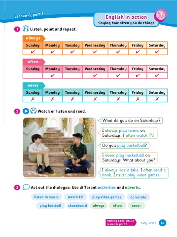 3 CULTURE ✗ ✗ Saying how often you do things watch them. a rac�et and tennis balls. 3.16 1 3 2 Lesson 6, part 1 Lesson 6, part 1 Lesson 6, part 1 Monday Tuesday camel racing Wednesday English in action Saturday 1 2 4 3 is fast! them! The man on the left camels. They are racing They are not only riding the photograph doing? What are the people in