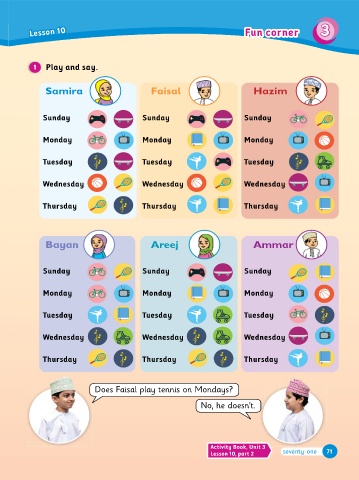 70 Get ready for ... Lesson 10, part 2 Lesson 10, part 2 Activity Book, Unit 3 No, he doesn’t. 4 Areej Faisal on Wednesdays? Lesson 9Lesson 10 Bayan Samira Play and say. Thursday Wednesday Tuesday Monday Sunday Thursday Wednesday Tuesday Monday Sunday 1 Lesson 10 Lesson 9 1 Thursday Does Faisal play tennis on Mondays? Thursday seventy-one seventy 1 6 He roller-skates on Thursdays. 5 He often watches TV on Wednesdays. 4 He do