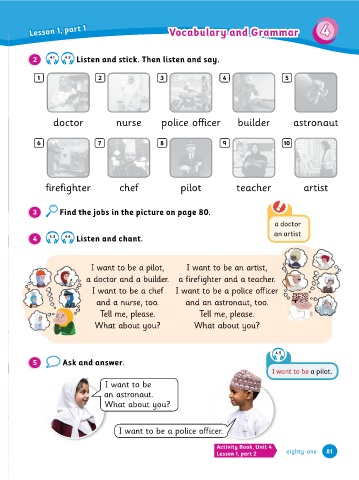 80 81 1 4 eighty artist astronaut eighty-one eighty-one 5 10 4.5 a doctor an artist I want to be a pilot. I want to be a doctor! 1 6 5 4 3 2 Lesson 1, part 1 Lesson 1 Lesson 1 Lesson 1 Find the jobs in the picture on page 80. Lesson 1, part 2 I want to be a doctor! I want to be a pilot. 1