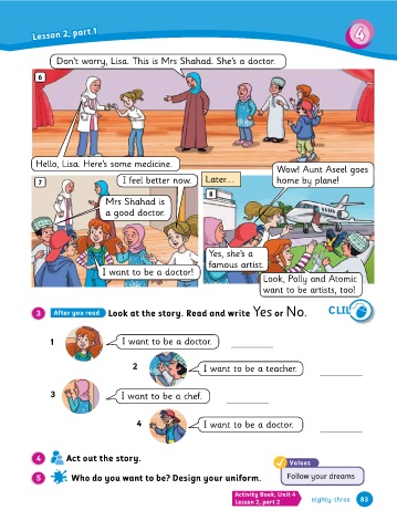 Story 4 eighty-two Watch or listen and read. This is Mr Ahmed. He’s a pilot. Who do you want to be? Design your uniform. Act out the story. Don’t worry, Lisa. This is Mrs Shahad. She’s a doctor. After you read Look at the story. Read and write Yes or No. 3 1 7 6 5 4 3 Hello, Lisa. Here’s some medicine. Lesson 2, part 1 Lesson 2, part 1 Lesson 2, part 1 I want to be a doctor! I can teach you. 5 3 I want to be a doctor. I want to be a che�! Fl