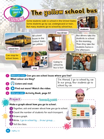 L 4 1 1 CULTURE s. But many students go to school by school bus. Mohammed the afternoon. Read and order. . 1 3 2 Lesson 6, part 1 Lesson 6, part 1 Lesson 6, part 1 This is Ahmed. My phone number is 76598710. 123�5708 ev Find out more! Watch the video. Listen and read. en Lesson 5, Lesson 5, After you read Activity Book, page 57. 4.16 Before you read Can you see school buses where you live? 4 4 school bus CULTURE 1 4 3