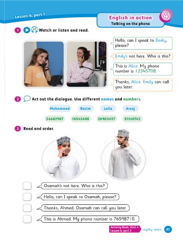 4 CULTURE eighty-seven But many students go to school by school bus. Mohammed the afternoon. Read and order. 1 3 2 Lesson 6, part 1 Lesson 6, part 1 Lesson 6, part 1 This is Ahmed. My phone number is 76598710. But many students go to school by school bus. Some students go by car, underground or train. Some students walk to school in the United States. eighty-seven eighty-six Find out more! Watch the video. Listen and read. Write. I go to school by ..