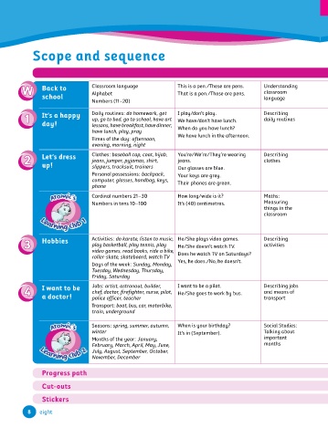1 It’s a happy Class Book: Pre A1 Starters Reading and Writing Part 5 Daily routines: do homework, get I play/don’t play. Saying the time It’s half past seven. Describing Traditional breakfasts Project: A breakfast menu in Traditional breakfasts Saying the time I play/don’t play. wh, ph Class Book: Pre A1 Starters 1