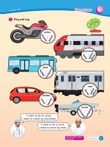 Get ready for ... I want to be a pilot. builder 2 I want to travel by train. 2 Lesson 9 I I want to travel by motorbi�e. Lesson 9Lesson 10 Lesson 9Lesson 10 Play and say. 1 Lesson 10 Lesson 9 Lesson 10 Lesson 9 1 Play and say. Lesson 9 Activity Book, Unit 4 2 2 2 teacher firefighter doctor 3 3 3 I want to be a pilot. Lesson 10 Fun corner I want to be a teacher. She goes to work by car. I want to be an artist. 3 officer 3 1