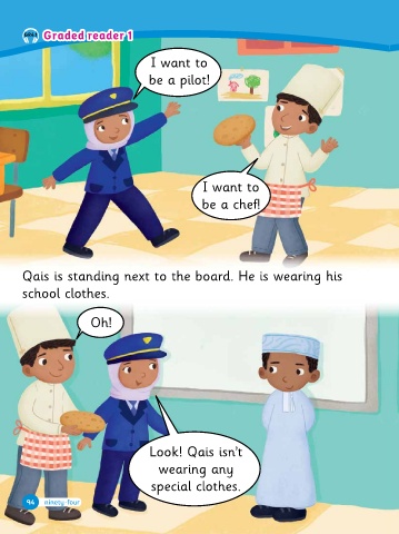 9495 9495 9495 9495 4 Graded reader 1 to be a teacher! Yes, I do! I want be a pilot! Don’t you have a �avourite job, Qais? �avourite job, Qais? That’s a great job! Oh! ninety-fiveninety-four ninety-fiveninety-four Graded reader 1 4 GR4.1 school clothes. Qais is standing next to the board. He is wearing his
