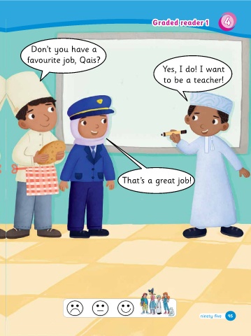 94 95 94 95 94 95 94 95 Graded reader 1 to be a teacher! Yes, I do! I want be a pilot! Don’t you have a �avourite job, Qais? �avourite job, Qais? That’s a great job! Oh! ninety-five ninety-four ninety-five ninety-four 4 Graded reader 1 95 94 GR4.1 school clothes. Qais is standing next to the board. He is wearing his