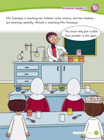 Graded r eader 2 4 4 Graded reader 2 Mrs Sumaiya is teaching the children some science, and the children are listening care�ully. Ahmed is watching Mrs Sumaiya. You must only put a little blue powder in the glass. one hundred and three 103