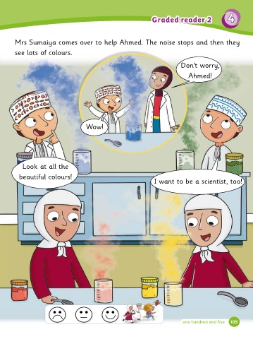 Graded reader 2 4 4 Graded r eader 2 Mrs Sumaiya comes over to help Ahmed. The noise stops and then they see lots o� colours. Don’t worry, Ahmed! Wow! Loo� at all the beauti�ul colours! I want to be a scientist, too! one hundred and five 105