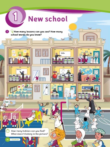 1 1 New school 1 How many lessons can you see? How many school words do you know? How many hobbies can you find? What doesn’t belong in the picture? 14 fourteen