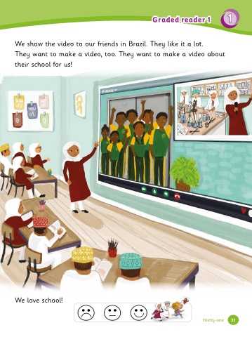 Graded r eader 1 1 1 Graded reader 1 We show the video to our �riends in Brazil. They li�e it a lot. They want to ma�e a video, too. They want to ma�e a video about their school �or us! We love school! thirty-one 31