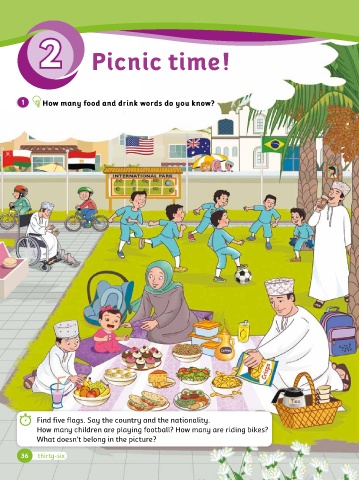 2 2 Picnic time! 1 How many food and drink words do you know? Find five flags. Say the country and the nationality. How many children are playing football? How many are riding bikes? What doesn’t belong in the picture? 36 thirty-six