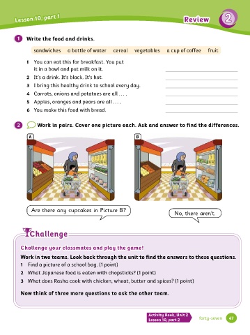 2 Work in pairs. Cover one picture each. Ask and answer to find the differences.