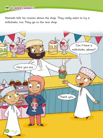 Graded reader 1 Graded r eader 1 GR1.1 Hamzah tells his cousins about the shop. They really want to try a mil�sha�e, too. They go to the new shop. Can I have a mil�sha�e, please? Here you are. Than� you. 52 fifty-two
