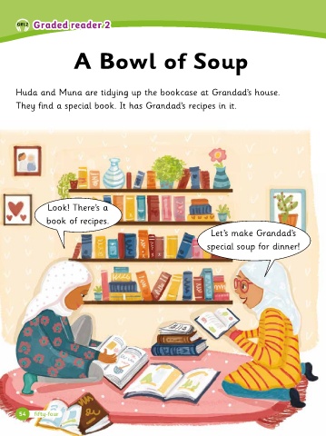 Huda and Muna are tidying up the boo�case at Grandad’s house.