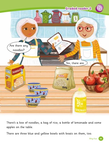 Graded reader 2 2 2 Graded r eader 2 Are there any noodles? Yes, there are. There’s a box o� noodles, a bag o� rice, a bottle o� lemonade and some apples on the table. There are three blue and yellow bowls with boats on them, too. fifty-five 55