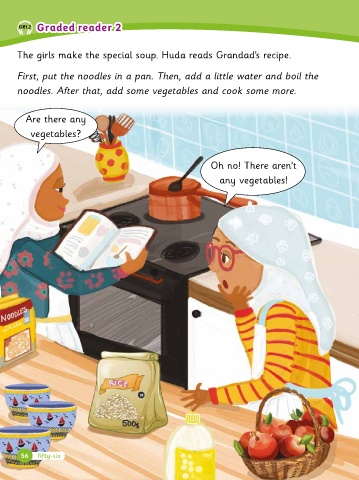 The girls ma�e the special soup. Huda reads Grandad’s recipe.