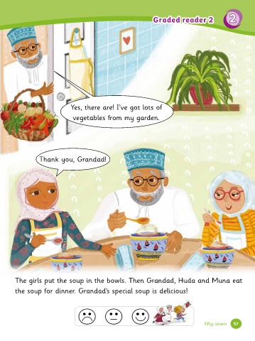 The girls put the soup in the bowls. Then Grandad, Huda and Muna eat