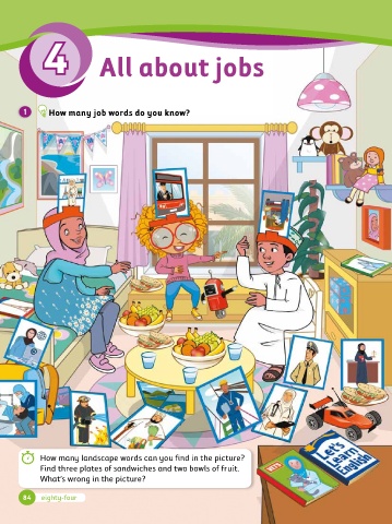 4 4 All about jobs 1 How many job words do you know? How many landscape words can you find in the picture? Find three plates of sandwiches and two bowls of fruit. What’s wrong in the picture? 84 eighty-four