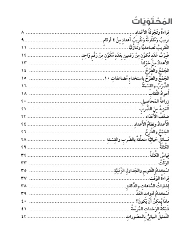 ُ الم ْحَت َوَي ُ اتِ .................................................................... 8ة ْ األعدادُئراءة َ وت ْجِزَِ ُقِ ْن 4 ٍ أرقام.................................................9ٍ مَعداديب أُتْقِرة َ وَُم َ قارنُُ ترتيب َ وًّا.............................................................. 11ا وتنازليًّ ُالت ُ قريبَ تصاعديَِّ ْن َ رْقٍم َ و ِ احٍد ................................. 12و ٍن م مَكٍَّ ُِ ْن َ ر ِ قمين بَِعَددَّكو ٍن م مٍ ُب َ عَددْ َُضرِنا ..................................................................... 13ِ ْن َ ح ْولَ ُ عداد ماألح ........................................................................ 14ْ ُ والطرَّعَُ الج ْم م ِ ضاعفات 10 ...............................................15ح ِ باستخدامُْ ُ والطرَّعَُ الج ْمة ...................................................................... 16ُْسَمِب والقْ ُالضرَّ الث ِ قاب .......................................................................... 18َِّ ُ عوادأراعة َ الم ِحاص ِ يل....................................................................... 20ُِز الض ِرب...................................................................... 21َِّ َنزيد مَ الم ُِ ......................................................................... 22ْعَدادَف األُِضْعِ .................................................................. 24َعدادِ ُظام األَ ُ عداد وناألرح ......................................................................... 26 والط َُّعَُ الج ْمِ ................................................. 28ْسَمةِ بالض ِرب والقَّقةِّ ٌة متعلٌَّيِل َ حياتَُِمسائلة .................................................................................. 29ُالكَتُلة............................................................................ 32ُ الكَتُِ ُ ياسقت ................................................................................ 33َ الوْق ُِ..................................................... 35َّةيِ الت ِ قويم َ والج ِ داول َّ الزَمنِ ُ خدام َّْ استراءة َ الوْق ِت........................................................................... 37ِ ُقَّ والد ِ قائق............................................................ 38 الس ِ اعاتإِ ُ شارات َّد .................................................................. 39ِ ُ خدام ِ أدوات َ العِّْ استْن َ ي َ كون؟ .................................................................. 40َن أُ ماذا ي ِمكُعة ............................................................... 41َّ ُكة َ الو َح ِ دات ُ المربَ َُشبي بِ َ المص ِ ورات............................................................. 42ُِّمثيل البيانُالتَُّ الم ْحَت َوَي ُ اتِ .................................................................... 8ة ْ األعدادُئراءة َ وت ْجِزَِ ُقِ ْن 4 ٍ أرقام.................................................9ٍ مَعداديب أُتْقِرة َ وَُم َ قارنُُ ترتيب َ وًّا.............................................................. 11ا وتنازليًّ ُالت ُ قريبَ تصاعديَِّ ْن َ رْقٍم َ و ِ احٍد ................................. 12و ٍن م مَكٍَّ ُِ ْن َ ر ِ قمين بَِعَددَّكو ٍن م مٍ ُب َ عَددْ َُضرِنا ..................................................................... 13ِ ْن َ ح ْولَ ُ عداد ماألح ........................................................................ 14ْ ُ والطرَّعَُ الج ْم م ِ ضاعفات 10 ...............................................15ح ِ باستخدامُْ ُ والطرَّعَُ الج ْمة ...................................................................... 16ُْسَمِب والقْ ُالضرَّ الث ِ قاب .......................................................................... 18َِّ ُ عوادأراعة َ الم ِحاص ِ يل....................................................................... 20ُِز الض ِرب...................................................................... 21َِّ َنزيد مَ الم ُِ ......................................................................... 22ْعَدادَف األُِضْعِ .................................................................. 24َعدادِ ُظام األَ ُ عداد وناألرح ......................................................................... 26 والط َُّعَُ الج ْمِ ................................................. 28ْسَمةِ بالض ِرب والقَّقةِّ ٌة متعلٌَّيِل َ حياتَُِمسائلة .................................................................................. 29ُالكَتُلة............................................................................ 32ُ الكَتُِ ُ ياسقت ................................................................................ 33َ الوْق ُِ..................................................... 35َّةيِ الت ِ قويم َ والج ِ داول َّ الزَمنِ ُ خدام َّْ استراءة َ الوْق ِت........................................................................... 37ِ ُقَّ والد ِ قائق............................................................ 38 الس ِ اعاتإِ ُ شارات َّد .................................................................. 39ِ ُ 