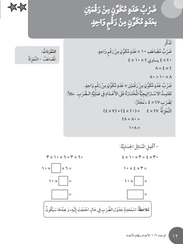 الوحدة 1أ: 1 األعداد ونظاماألعدادونَُ ُكنَْدَه َ ا سيِِ َ، و عْهليَِت ْج َت إِ ْ احَْ ِبِيف َ حالرضم َ ج ْدَول الَُِّتخدة: ْ اسٌَُ َالح َظمََّة: ِيَسابَِل احلِِ ِل َ املَسائ- أَ ْكم30 × 4 = 3 × 10 × 4 60 × 3 = 6 × 10 × 3 = 3 × 4 × 10 = 6 × × 10 = × 10 × = 10 = = ُ ات:المْفَرَدُةَُِئ - الت ْجزَّفاملَض َاع ُُِْيمقَْ رَنِْ مٍونُ َكَّ مٍددَ عَبْ ُضٍَدِ واحَمٍقْ رَنِْ مٍونُ َكَّ مٍددَبعَكر ََّذٍِ دْن َ رْق ٍم َ واحٍِ مونُ َكٍَّ مف 10 × َ عَددُ َض َاع ِب مْ ُض2 × 4 يساوي 2 × 10 × 4 × 4 = 8 × 10 = 80ٍ . ِ دْن َ رْق ٍم َ واحٍِ مونُ َكٍَّ مِ َ × عَددْن َ رْقَمْنٍِ مونُ َكٍَّ مب َ عَددْ ُضْ ِب ً . مثال: �رضِ ال ََّّةيِِ َ يف عَملَ ْع َ�دادة َ عَى األت َ �ارُ امل ْخَُةَُِّيِيج�د ْ االس َ �رتاتِ ُتم ْعَُار:تْ ِب 27 × 4 ، َ ن ْخََرضة 27 × 4( = 20 × 4( + )7 × 4 )َُِئت ْجزَّ = 80 + 28 = 108الوحدة 1أ: 1 األعداد ونظاماألعداد 12َ ُك ُوننَْدَه َ ا سيِِ َ، و عْهليَِت ْج َت إِ ْ احَْ ِبِيف َ حالرضُم َ ج ْدَول الَِّتخدُ َالح َظٌة: ْ اسَمََّة: ِيَسابَِل احلِِ ِل َ املَسائ- أَ ْكم30 × 4 = 3 × 10 × 4 60 × 3 = 6 × 10 × 3 = 3 × 4 × 10 = 6 × × 10 = × 10 × = 10 = = المْفَرَد ُ ات:َُِئُة - الت ْجزُاملَض َاع ُف َِّْيمقَْ رَنِْ مٍونُ َكَّ مٍددَ عَبْ ُضٍَدِ واحَمٍقْ رَنِْ مٍونُ َكَّ مٍددَبعَكر ََّتَذٍِ دْن َ رْق ٍم َ واحٍِ مونُ َكٍَّ مف 10 × َ عَددُ َض َاع ِب مْ َُض20 × 4 يساوي 2 × 10 × 42 × 4 = 88 × 10 = 80ٍ . ِ دْن َ رْق ٍم َ واحٍِ مونُ َكٍَّ مِ َ × عَددْن َ رْقَمْنٍِ مونُ َكٍَّ مب َ عَددْ َُضْ ِب ً . مثال: �رضِ ال ََّّةيِِ َ يف عَملَ ْع َ�دادة َ عَى األت َ �ارُ امل ْخَُةَُِّيِيج�د ْ االس َ �رتاتِ ُتمَت ْعَُار:تْ ِب 27 × 4 ، َ ن ْخََرضِلة 27 × 4( = 20 × 4( + )7 × 4 )َُِئالت ْجزَّ = 80 + 28 = 108الوحدة 1أ: 1 األعداد ونظاماألعداد 1ونَُ ُكنَْدَه َ ا سيِِ َ، و عْهليَِت ْج َت إِ ْ احَْ ِبِيف َ حالرضم َ ج ْدَول الَُِّتخدة: ْ اسٌَُ َالح َظمََّة: ِيَسابَِل احلِِ ِل َ املَسائ- أَ ْكم30 × 4 = 3 × 10 × 4 60 × 3 = 6 × 10 × 3 = 3 × 4 × 10 = 6 × × 10 = × 10 × = 10 = = ُ ات:المْفَرَدُةَُِئ - الت ْجزَّفاملَض َاع ُُِْيمقَْ رَنِْ مٍونُ َكَّ مٍددَ عَبْ ُضٍَدِ واحَمٍقْ رَنِْ مٍونُ َكَّ مٍددَبعَكر ََّتَذٍِ دْن َ رْق ٍم َ واحٍِ مونُ َكٍَّ مف 10 × َ عَددُ َض َاع ِب مْ َُض20 × 4 يساوي 2 × 10 × 42 × 4 = 88 × 10 = 80ٍ . ِ دْن َ رْق ٍم َ واحٍِ مونُ َكٍَّ مِ َ × عَددْن َ رْقَمْنٍِ مونُ َكٍَّ مب َ عَددْ َُضْ ِب ً . مثال: �رضِ ال ََّّةيِِ َ يف عَملَ ْع َ�دادة َ عَى األت َ �ارُ امل ْخَُةَُِّيِيج�د ْ االس َ �رتاتِ ُتمَت ْعَُار:تْ ِب 27 × 4 ، َ ن ْخََرضِلة 27 × 4( = 20 × 4( + )7 × 4 )َُِئالت ْجزَّ = 80 + 28 = 108الوحدة 1أ: 1 األعداد ونظاماألعدادونَُ ُكنَْدَه َ ا سيِِ َ، و عْهليَِت ْج َت إِ ْ احَْ ِبِيف َ حالرضم َ ج ْدَول الَُِّتخدة: ْ اسٌَُ َالح َظمََّة: ِيَسابَِل احلِِ ِل َ املَسائ- أَ ْكم30 × 4 = 3 × 10 × 4 60 × 3 = 6 × 10 × 3 = 3 × 4 × 10 = 6 × × 10 = × 10 × = 10 = = ُ ات:المْفَرَدُةَُِئ - الت ْجزَّفاملَض َاع ُُِْيمقَْ رَنِْ مٍونُ َكَّ مٍددَ عَبْ ُضٍَدِ واحَمٍقْ رَنِْ مٍونُ َكَّ مٍددَبعَكر ََّتَذٍِ دْن َ رْق ٍم َ واحٍِ مونُ َكٍَّ مف 10 × َ عَددُ َض َاع ِب مْ َُض20 × 4 يساوي 2 × 10 × 42 × 4 = 88 × 10 = 80ٍ . ِ دْن َ رْق ٍم َ واحٍِ مونُ َكٍَّ مِ َ × عَددْن َ رْقَمْنٍِ مونُ َكٍَّ مب َ عَددْ َُضْ ِب ً . مثال: �رضِ ال ََّّةيِِ َ يف عَملَ ْع َ�دادة َ عَى األت َ �ارُ امل ْخَُةَُِّيِيج�د ْ االس َ �رتاتِ ُتمَت ْعَُار:تْ ِب 27 × 4 ، َ ن ْخََرضِلة 27 × 4( = 20 × 4( + )7 × 4 )َُِئالت ْجزَّ = 80 + 28 = 108الوحدة 1أ: 1 األعداد ونظاماألعداد1ونَُ ُكنَْدَه َ ا سيِِ َ، و عْهليَِت ْج َت إِ ْ احَْ ِبِيف َ حالرضم َ ج ْدَول الَُِّتخدة: ْ اسٌَُ َالح َظمََّة: ِيَسابَِل احلِِ ِل َ املَسائ- أَ ْكم30 × 4 = 3 × 10 × 4 60 × 3 = 6 × 10 × 3 = 3 × 4 × 10 = 6 × × 10 = × 10 × = 10 = = ُ ات:المْفَرَدُةَُِئ - الت ْجزَّفاملَض َاع ُُِْيمقَْ رَنِْ مٍونُ َكَّ مٍددَ عَبْ ُضٍَدِ واحَمٍقْ رَنِْ مٍونُ َكَّ مٍددَبعَكر ََّتَذٍِ دْن َ رْق ٍم َ واحٍِ مونُ َكٍَّ مف 10 × َ عَددُ َض َا