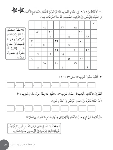 الوحدة 1أ: 3 الضرب والقسمة )1 )17ْ ِب 27 حتى 27 × 10: ت ْب َ ج ْدَوَل َ ض- ا ْكُُ3، ، ، ، ، ، ، ، ، ْ ِب 27؟ ِ َ ضه َ حْوَل َ ج ْدَولظُِ ُي تالحِ ُ. ما الذَّْ ِب 27ِ َ ضَه َ ا يف ج ْدَولَِ�طْنِ، وأََ ْعَدادَِىل األظْر إُاْنُ.ِِهْ بِ َ ضَِىل َ ج ْدَولصْل إَّْن َ رْقَم ِن َ وَتَوِو ًنا مُ َكَّْخَرت َ عَد ًدا مِا، ، ، ، ، ، ، ، ، ه؟ َْتُِ ْي اخَرتِ الذ العَددْ ِب َِ َ ضَه َ ا يف ج ْدَولَِ�طْنَ وأََِ ْعَدادٍ َ حْوَل األْ ءي َ شظ أَ َِّ ُ تالحَهْلُْمِْس َ�ت ْخدِ�ة: اٌُ َالح َظمُِم َض َ اعَفاتِت َك بِ َفََ ْعرم2 و 3 و 4 و 5 و 10ِي َ ج ْ�دَولِ أَ ِِّ ي�دت ْحدَِل�ن أَ ْنِ ُ ي ْمكُْ ٍبَضٍ أَ ْوُم�ودَ ُك َ �ون ِيف َ عيَا.ف مٍَّصْثَلِفَها مُِِ َ �ي ت ْعر التَّْ ِبرضِ الَِّقِ ْحَد َى طَرائْم إِْس َ�ت ْخدِة: اٌُ َالح َظمْ ِب .رضِ الٍَِّيف َ ج ْدَول كّل َ عَددَُِىلِ إصولُوْلُِِ لَ َكةِ َّ الشبِ َيقةَطرادَ ْعَد َِ ِم األت ْخدِ ْ . اسَتادمل ْعٍَ َ كا َُْةتبََُّرري مْ ِب َ هَذ َ ا غُْرضِ الََّىل10ِيف َ ج ْدَولِْن1 إِاد مَُ ْعَد2 -َ اْألَيها .ِِ فَْأل ْ الَفَر َ اغاتم ام، ثَُِّ ِ يحَّ الصحِ ِ يبْترتَِىل الَِّ إصولُوْلُِِ لَ َكة الشبِيف َّ×18 36 54100 30 8018 14 670 35 728 24 445 10 2512 9 2460 42 616 40 489 4 8الوحدة 1أ: 3 الضرب والقسمة )1 )17ْ ِب 27 حتى 27 × 10: ت ْب َ ج ْدَوَل َ ض- ا ْكُُ3، ، ، ، ، ، ، ، ، ْ ِب 27؟ ِ َ ضه َ حْوَل َ ج ْدَولظُِ ُي تالحِ ُ. ما الذَّْ ِب 27ِ َ ضَه َ ا يف ج ْدَولَِ�طْنِ، وأََ ْعَدادَِىل األظْر إُاْنُ.ِِهْ بِ َ ضَِىل َ ج ْدَولصْل إَّْن َ رْقَم ِن َ وَتَوِو ًنا مُ َكَّْخَرت َ عَد ًدا مِا، ، ، ، ، ، ، ، ، ه؟ َْتُِ ْي اخَرتِ الذ العَددْ ِب َِ َ ضَه َ ا يف ج ْدَولَِ�طْنَ وأََِ ْعَدادٍ َ حْوَل األْ ءي َ شظ أَ َِّ ُ تالحَهْلُْمِْس َ�ت ْخدِ�ة: اٌُ َالح َظمُِم َض َ اعَفاتِت َك بِ َفََ ْعرم2 و 3 و 4 و 5 و 10ِي َ ج ْ�دَولِ أَ ِِّ ي�دت ْحدَِل�ن أَ ْنِ ُ ي ْمكُْ ٍبَضٍ أَ ْوُم�ودَ ُك َ �ون ِيف َ عيَا.ف مٍَّصْثَلِفَها مُِِ َ �ي ت ْعر التَّْ ِبرضِ الَِّقِ ْحَد َى طَرائْم إِْس َ�ت ْخدِة: اٌُ َالح َظمْ ِب .رضِ الٍَِّيف َ ج ْدَول كّل َ عَددَُِىلِ إصولُوْلُِِ لَ َكةِ َّ الشبِ َيقةَطرادَ ْعَد َِ ِم األت ْخدِ ْ . اسَتادمل ْعٍَ َ كا َُْةتبََُّرري مْ ِب َ هَذ َ ا غُْرضِ الََّىل10ِيف َ ج ْدَولِْن1 إِاد مَُ ْعَد2 -َ اْألَيها .ِِ فَْأل ْ الَفَر َ اغاتم ام، ثَُِّ ِ يحَّ الصحِ ِ يبْترتَِىل الَِّ إصولُوْلُِِ لَ َكة الشبِيف َّ×18 36 54100 30 8018 14 670 35 728 24 445 10 2512 9 2460 42 616 40 489 4 8الوحدة 1أ: 3 الضرب والقسمة )1 )17ْ ِب 27 حتى 27 × 10: ت ْب َ ج ْدَوَل َ ض- ا ْكُُ3، ، ، ، ، ، ، ، ، ْ ِب 27؟ ِ َ ضه َ حْوَل َ ج ْدَولظُِ ُي تالحِ ُ. ما الذَّْ ِب 27ِ َ ضَه َ ا يف ج ْدَولَِ�طْنِ، وأََ ْعَدادَِىل األْ إظرُاْنُ.ِِهْ بِ َ ضَِىل َ ج ْدَولصْل إََّ ْقَم ِن َ وَتَوْن رِو ًنا مُ َكَّْخَرت َ عَد ًدا مِا، ، ، ، ، ، ، ، ، ه؟ َْتُِ ْي اخَرتِ الذ العَددْ ِب َِ َ ضَه َ ا يف ج ْدَولَِ�طْنَ وأََِ ْعَدادٍ َ حْوَل األْ ءي َ شظ أَ َِّ ُ تالحَهْلُِْمْس َ�ت ْخدِ�ة: اٌُ َالح َظمُِم َض َ اعَفاتِت َك بِ َفََ ْعرم2 و 3 و 4 و 5 و 10ِي َ ج ْ�دَولِ أَ ِِّ ي�دت ْحدَِل�ن أَ ْنِ ُُ ْمكْ ٍب يَضٍ أَ ْوُم�ودَ ُك َ �ون ِيف َ عيَا.ف مٍَّصْثَلِفَها مُِِ َ �ي ت ْعر التَّْ ِبرضِ الَِّقَ ائِ ْحَد َى طرْ إِمْس َ�ت ْخدِة: اٌُ َالح َظمْ ِب .رضِ الٍَِّيف َ ج ْدَول كّل َ عَددَُِىلِ إصولُوْلُِِ لَ َكة الشبِ َِّ َيقةَطرادَ ْعَد َِ ِم األت ْخدِ ْ . اسَتادمل ْعٍَ َ كا َُْةتبََّرُري مْ ِب َ هَذ َ ا غُْرضِ الََّىل10ِيف َ ج ْدَولِْن1 إِاد مَُ ْعَد2 -َ اْألَيها .ِِ فَ َ اغاتَْأل ْ الَفرم ام، ثَُِّ ِ يحَّ الصحِ ِ يبْترتَِىل الَِّ إصولُوْلُِِ لَ َكة الشبِيف َّ×18 36 54100 30 8018 14 670 35 728 24 445 10 2512 9 2460 42 616 40 489 4 8الوحدة 1أ: 3 الضرب والقسمة )1)7ْ ِب 27 حتى 27 × 10: ت ْب َ ج ْدَوَل َ ض- ا ْكُُ3، ، ، ، ، ، ، ، ، ْ ِب 27؟ ِ َ ضه َ حْوَل َ ج ْدَولظُِ ُي تالحِ ُ. ما الذَّْ ِب 27ِ َ ضَه َ ا يف ج ْدَولَِ�طْنِ، وأََ ْعَدادَِىل ا