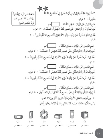 الوحدة 1ب: 4 الكتلةلُِحتَ�اوٍ ُ�رةَ َّل مُِّيف كُ َالح َظ�ة: مٍ ، ِ يديس َ جدِ ٍ�ة كُ كْتَلَُيرَِيه َ ا تْقدِفِ .ِقَّ السابيسِ ِِ ْالكه بْنَُِقار)أ(3100 غم)ب(4900 غم)ج(3950 غم)د(7200 غم)ه�(3700 غم)و(8900 غمةُُ الكْتَلِ َح ت ْصبَُِىل أَ ْنٍ إدوق صنُُْْويس أَِ ٍَِىل كَ إِ أَ ْشياءِ َض َافة- ق ْم بإُ3ِ َك 100 غرام. ِ يرتْقدَِبُ الكْتَلَة .ِ َ . س ّج ِلَيزانَِض ِع ْ الك غم ِ َ يس َ عَى ا ْملدوق 100 غرام. يس ّ أو الصنُِْ ُة الكُى تصبح ك َتلُتِ َ الكتل حََّزَالةِِ أَو إِ َض َافةق ْم بإُِ َك 200ِ يرتْقدَِة بُُ الكْتَلَِىل أَ ْن تصبح َ إَاءَ ْشيِ األْهليَِِ ْف إد ًوق َ ا آخَرَ وأَض صنُُْْوً يسا أَِخ ْذ كُغرام. ة .ُُ الكْتَلِ َ . س ّج ِلَيزانَِض ِع ْ الك غم ِ َ يس َ عَى ا ْملوق 200 غرام. ُديس ّ أو الصنُِْ ُى تصبح كْتَلَة الكُتَِّ ُ الكْت ِل َ حَزَالةِِ أَو إِ َض َافةق ْم بإُِ َك400ِ يرتْقدَِ بُُِ الكْتَلةَِىل أَ ْن تصبح َ إَاءَ ْشيِ األْهليَِِ ْف إد ًوق َ ا آخَرَ وأَض صنُُْْوً يسا أَِخ ْذ كُغرام. ُ الكْتَلَة .ِ َ . س ّج ِلَيزانَِض ِع ْ الك غم ِ َ يس َ عَى ا ْملوق 400 غرام. ُديس ّ أو الصنُِْ ُة الكُى تصبح كْتَلُتَِّ ُ الكْت ِل َ حَزَالةِِ أَو إِ َض َافةق ْم بإُِ َك800ِ يرتْقدَِة بُُ الكْتَلَِىل أَ ْن تصبح َ إَاءَ ْشيِ األْهليَِِ ْف إد ًوق َ ا آخَرَ وأَض صنُُْْوً يسا أَِخ ْذ كُغرام. ُ الكْتَلَة .ِ َ . س ّج ِلَيزانَِض ِع ْ الك غم ِ َ يس َ عَى ا ْملوق 800 غرام. ُديس ّ أو الصنُِْ ُة الكُى تصبح كْتَلُتَّت ِل َ حِ ُ الكََزَالةِِ أَو إِ َض َافةق ْم بإَُن 16 كغم. ِثَر مِ أَ ْكَِيدل الَربَُّ� عَُ ْرَفَع يَّ العَم ِل أَالِ َِدْن َ قَواعِ4 -مٍ. َانَمِأعَها بن َ رْفُُِ ي ْمكثُْ ُِ َحيِ بتْنُْم َوعَِ ْم َن َجمََة ضيِ التالَّر َود الطَُُّرّت ِبالوحدة 1ب: 4 الكتلةلُِحتَ�اوٍ ُ�رةَ َّل مُِّيف كُ َالح َظ�ة: مٍ ، ِ يديس َ جدِ ٍ�ة كُ كْتَلَُيرَِيه َ ا تْقدِفِ .ِقَّ السابيسِ ِِ ْالكه بْنَُِقار)أ(3100 غم)ب(4900 غم)ج(3950 غم)د(7200 غم)ه�(3700 غم)و(8900 غمةُُ الكْتَلِ َح ت ْصبَُِىل أَ ْنٍ إدوق صنُُْْويس أَِ ٍَِىل كَ إِ أَ ْشياءِ َض َافة- ق ْم بإُ3ِ َك 100 غرام. ِ يرتْقدَِبُ الكْتَلَة .ِ َ . س ّج ِلَيزانَِض ِع ْ الك غم ِ َ يس َ عَى ا ْملدوق 100 غرام. يس ّ أو الصنُِْ ُة الكُى تصبح ك َتلُتِ َ الكتل حََّزَالةِِ أَو إِ َض َافةق ْم بإُِ َك 200ِ يرتْقدَِة بُُ الكْتَلَِىل أَ ْن تصبح َ إَاءَ ْشيِ األْهليَِِ ْف إد ًوق َ ا آخَرَ وأَض صنُُْْوً يسا أَِخ ْذ كُغرام. ة .ُُ الكْتَلِ َ . س ّج ِلَيزانَِض ِع ْ الك غم ِ َ يس َ عَى ا ْملوق 200 غرام. ُديس ّ أو الصنُِْ ُى تصبح كْتَلَة الكُتَِّ ُ الكْت ِل َ حَزَالةِِ أَو إِ َض َافةق ْم بإُِ َك400ِ يرتْقدَِ بُُِ الكْتَلةَِىل أَ ْن تصبح َ إَاءَ ْشيِ األْهليَِِ ْف إد ًوق َ ا آخَرَ وأَض صنُُْْوً يسا أَِخ ْذ كُغرام. ُ الكْتَلَة .ِ َ . س ّج ِلَيزانَِض ِع ْ الك غم ِ َ يس َ عَى ا ْملوق 400 غرام. ُديس ّ أو الصنُِْ ُة الكُى تصبح كْتَلُتَِّ ُ الكْت ِل َ حَزَالةِِ أَو إِ َض َافةق ْم بإُِ َك800ِ يرتْقدَِة بُُ الكْتَلَِىل أَ ْن تصبح َ إَاءَ ْشيِ األْهليَِِ ْف إد ًوق َ ا آخَرَ وأَض صنُُْْوً يسا أَِخ ْذ كُغرام. ُ الكْتَلَة .ِ َ . س ّج ِلَيزانَِض ِع ْ الك غم ِ َ يس َ عَى ا ْملوق 800 غرام. ُديس ّ أو الصنُِْ ُة الكُى تصبح كْتَلُتَّت ِل َ حِ ُ الكََزَالةِِ أَو إِ َض َافةق ْم بإَُن 16 كغم. ِثَر مِ أَ ْكَِيدل الَربَُّ� عَُ ْرَفَع يَّ العَم ِل أَالِ َِدْن َ قَواعِ4 -مٍ. َانَمِأعَها بن َ رْفُُِ ي ْمكثُْ ُِ َحيِ بتْنُْم َوعَِ ْم َن َجمََة ضيِ التالَّر َود الطَُُّرّت ِبالوحدة 1ب: 4 الكتلة 30لُِحتَ�اوٍ َُّ ةَ�رل مُِّيف كُ َالح َظ�ة: مٍ ، ِ يديس َ جدِ ٍ�ة كُ كْتَلَ ُِ يرَيه َ ا تْقدِفِ .ِقَّ السابيسِ ِِ ْالكه بْنَُِقار)أ(3100 غم)ب(4900 غم)ج(3950 غم)د(7200 غم)ه�(3700 غم)و(8900 غمةُُ الكْتَلِ َح ت ْصبَُِىل أَ ْنٍ إدوق صنُُْْويس أَِ ٍَِىل كَ إِ أَ ْشياءِ َض َافة- ق ْم بإُ3ِ َك 100 غرام. ِ يرتْقدَِبُ الكْتَلَة .ِ َ . س ّج ِلَيزانَِض ِ