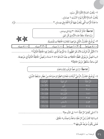 الوحدة 1 ب : 5 الوقت )1 )َ يس ْمِرب. ًِا يف دَ ْوم هنَ َ اك 31 ين ُكْر أَ ََّّة: َت ّذٌُ َالح َظمٍ.ُ يف كّل َ ش ْهرَّ ِامَيِ األظ َ عَددُِ ْفد َك حُِيَساعَسٍُ . ْتل سبَّ كُُ الكَرَة حَس ٌامُبَُ ْلَع2 -يَ يس ْمِرب. ِِ 1 دْتَّ السبَ ْوَمُ الكَرَة ي حَس ٌامُبَُ ْلَعيرة. ََِّ ْ يسمِرب ؟ ........................................... ما كَرَة ْ الَقَدِمِيف دَُيهِب فَُ ْلَعِي ي التِ َّراتد ا َْملََُّ ما عَدِ. ِ ينَةْلَمدِِ لَالتَِافِ ا ْحلادَرةُ َغ َِ َيد مََواع الت ِال مل ََُّ ْدَوح ا ْجلضُِّ- يَو3ُ 00:8 ً صباحا 30:10 ً صباحا 00:1 مساء 30:3 مساء 00:5 مساءة ؟ .......................َُيِ التالَّةَُلَِافِ ا ْحلِيهر فُِتَغادُِ َي س الذَّدَُِا ا َْملْوعة. مُِ َري الظهَّ هَون َ الو ْق َت َ اآلن َُّْل أَ َّ) أ ( ََختيَها. ِِدَ ْوعةِيف مَُيِ التالَّةَُلَِافل ا ْحلِ ًُ َ ، وَتصَ َساءِ 45:2 منَْد َّ الس َاعةِِ عَالتَِافِ ا ْحلطةَ ََِّىل َحمم إَ َُ ْريل مِ َُ )ب( تصَلَة؟ ...........................................................َِافم احلَ َُ ْرير مُِتظتنََْك ْم ً ساعة َ سَ.ُِلمَس َاعَدةِِ لط َ الو ْقتَّة: ْارُس ْم َ خٌُ َالح َظمَ ْسَق َط َّ الد ْوِل. ِ مَ َطارْن مَِ ً احا مِ َ صبِ َ الطََريانادَرةُ َغ َْوَق َ ات مي أََُِّنل َّ الزمَُ ْدَوح اجل- يَو ّضُ4ُ ةُة ّ الر ْحَلُتَُ الو ْق ْ الوجَهدب 30:10322ُ ري 351 وتب 35:10ُْ َ َّ الد ْو َحة 45:10151َ القاه 00:11 ِ 382 رة243 باريس 10:11214 لندن 15:11ِ؟ ...................................................َّ إىل الدوحةة 151ُِّ الر ْحَلرُِى تَغادُتََ) أ ( مَق. ِ دَقائِ َدًة و5َ َ س َاعًة َ واحِن ّ الر ْحَلةَ َُ )ب( إذا ك َ ان َ زمَها ؟ ...........................................................ِبوطُ هُدَُِ ْوعون مَُ ُكتى يَفَمَالوحدة 1 ب : 5 الوقت )1 )3َ يس ْمِرب. ًِا يف دَ ْوم هنَ َ اك 31 ين ُكْر أَ ََّّة: َت ّذٌُ َالح َظمٍ.ُ يف كّل َ ش ْهرَّ ِامَيِ األظ َ عَددُِ ْفد َك حُِيَساعَسٍُ . ْتل سبَّ كُُ الكَرَة حَس ٌامُبَُ ْلَع2 -يَ يس ْمِرب. ِِ 1 دْتَّ السبَ ْوَمُ الكَرَة ي حَس ٌامُبَُ ْلَعيرة. ََِّ ْ يسمِرب ؟ ........................................... ما كَرَة ْ الَقَدِمِيف دَُيهِب فَُ ْلَعِي ي التِ َّراتد ا َْملََُّ ما عَدِ. ِ ينَةْلَمدِِ لَالتَِافِ ا ْحلادَرةُ َغ َِ َيد مََواع الت ِال مل ََُّ ْدَوح ا ْجلضُِّ- يَو3ُ 00:8 ً صباحا 30:10 ً صباحا 00:1 مساء 30:3 مساء 00:5 مساءة ؟ .......................َُيِ التالَّةَُلَِافِ ا ْحلِيهر فُِتَغادُِ َي س الذَّدَُِا ا َْملْوعة. مُِ َري الظهَّ هَون َ الو ْق َت َ اآلن َُّْل أَ َّ) أ ( ََختيَها. ِِدَ ْوعةِيف مَُيِ التالَّةَُلَِافل ا ْحلِ ًُ َ ، وَتصَ َساءِ 45:2 منَْد َّ الس َاعةِِ عَالتَِافِ ا ْحلطةَ ََِّىل َحمم إَ َُ ْريل مِ َُ )ب( تصَلَة؟ ...........................................................َِافم احلَ َُ ْرير مُِتظتنََْك ْم ً ساعة َ سَ.ُِلمَس َاعَدةِِ لط َ الو ْقتَّة: ْارُس ْم َ خٌُ َالح َظمَ ْسَق َط َّ الد ْوِل. ِ مَ َطارْن مَِ ً احا مِ َ صبِ َ الطََريانادَرةُ َغ َْوَق َ ات مي أََُِّنل َّ الزمَُ ْدَوح اجل- يَو ّضُ4ُ ةُة ّ الر ْحَلُتَُ الو ْق ْ الوجَهدب 30:10322ُ ري 351 وتب 35:10ُْ َ َّ الد ْو َحة 45:10151َ القاه 00:11 ِ 382 رة243 باريس 10:11214 لندن 15:11ِ؟ ...................................................َّ إىل الدوحةة 151ُِّ الر ْحَلرُِى تَغادُتََ) أ ( مَق. ِ دَقائِ َدًة و5َ َ س َاعًة َ واحِن ّ الر ْحَلةَ َُ )ب( إذا ك َ ان َ زمَها ؟ ...........................................................ِبوطُ هُدَُِ ْوعون مَُ ُكتى يَفَمَالوحدة 1 ب : 5 الوقت )1 )36َ يس ْمِرب. ًِا يف دَ ْوم هنَ َ اك 31 ين ُكْر أَ ََّّة: َت ّذٌُ َالح َظمٍ.ُ يف كّل َ ش ْهرَّ ِامَيِ األظ َ عَددُِ ْفد َك حُِيَساعَسٍُ . ْتل سبَّ كُُ الكَرَة حَس ٌامُبَُ ْلَع2 -يَ يس ْمِرب. ِِ 1 دْتَّ السبَ ْوَمُ الكَرَة ي حَس ٌامُبَُ ْلَعيرة. ََِّ ْ يسمِرب ؟ ........................................... ما كَرَة ْ الَقَدِمِيف دَُيهِب فَُ ْلَعِي ي التِ َّراتد ا َْملََُّ ما عَدِ. ِ ينَةْلَمدِِ لَالتَِافِ ا ْحلادَرةُ َغ َِ َيد مََواع الت ِال مل ََُّ ْدَوح ا ْجلضُِّ- يَو3ُ 00:8 ً صباحا 30:10 ً صباحا 00:1 مساء 30:3 مساء 00:5 مساءة ؟ .....................