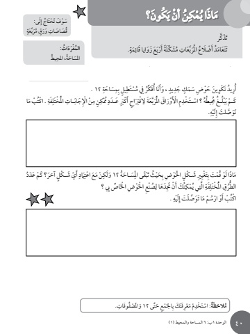 الوحدة 1ب: 6 المساحة والمحيط )1 )لى: َُِاج إتٍ َسْو َفَ ت ْحَََّعةَُربٍ مِ َ وَرقق َص َ اصاتُِ .ف َوفاتُتى 12 َ و َامل ْصَ ْم ِع َ حَِّاجلت َك بِ َفََ ْعرْم مِت ْخدة: ْ اسٌَُ َالح َظمِ 12 . َس َ احةِِمِ ٍ يل بتطُ ْسَرِيف مِّكَُنا أَُفٍ َ ، وأَِ يدٍ َ جدِ َ ين َ حْو ِض َ سَمكيد َ ت ْكوِ ُرأَُا ت ْب مِ ْ . اكَُفةِتلمل ْخَِ ا َُْ�اتِ َجابْن اْإلِِ ٍن مْكممٍُِ َ ع َ�ددَ ِ اح أَ ْكَربِِ ْقرتََّعَةالملَربْوَر َاق ا َُِْ ِم اْأله ْ ؟ اس َ�ت ْخديطُِ ُحمُ�غُلَُْبَك ْ�م يِ. ْهليَِص َ لت إََّتَودُِ أَ ّي َ ش ْ�ك ٍل َ آخر َ؟ ك ْم َ عَدَ�دَِ َع ْ اعتْن مِلكة 12 َ وََُس َ �احَِْقى ا ْملثَ تبْ ُِ َحيَ ْو ِض بِ ِري َ ش ْ�ك ِل ا ْحلت ْغيَِ ق ْم َت بَُ َاذ َ ا ل ْومَ ِّ اصِ ب ؟ َ ْو ِض ا ْخلصنْ ِع ا ْحلَُِدَها لُِ َك أَ ْن َجتنِي ي ْمكِ ُ التِ ََّفةِتلمل ْخَِ ا ُْرقالطُُِّ .ْهليَِصَل َت إََّ َ ا تَوْو ْ ارُس ْم مت ْب أَْ اكُُ ات:المْفَرَدُيطِ ُة، املحَُ املس َ احون؟ُك ََْ أن ينُِمكُ ْاذا يََمكر ََّتَذ.ٍَمةَِ َع َ زَو َ ايا قائْربِّكَلًة أَُ َشِ مََّعات املَربُعد أَ ْضَالَُ ُتَعامَتَالوحدة 1ب: 6 المساحة والمحيط )1 )40لى: َُِاج إتٍ َسْو َفَ ت ْحَََّعةَُربٍ مِ َ وَرقق َص َ اصاتُِ .ف َوفاتُتى 12 َ و َامل ْصَ ْم ِع َ حَِّاجلت َك بِ َفََ ْعرْم مِت ْخدة: ْ اسٌَُ َالح َظمِ 12 . َس َ احةِِمِ ٍ يل بتطُ ْسَرِيف مِّكَُنا أَُفٍ َ ، وأَِ يدٍ َ جدِ َ ين َ حْو ِض َ سَمكيد َ ت ْكوِ ُرأَُا ت ْب مِ ْ . اكَُفةِتلمل ْخَِ ا َُْ�اتِ َجابْن اْإلِِ ٍن مْكممٍُِ َ ع َ�ددَ ِ اح أَ ْكَربِِ ْقرتََّعَةالملَربْوَر َاق ا َُِْ ِم اْأله ْ ؟ اس َ�ت ْخديطُِ ُحمُ�غُلَُْبَك ْ�م يِ. ْهليَِص َ لت إََّتَودُِ أَ ّي َ ش ْ�ك ٍل َ آخر َ؟ ك ْم َ عَدَ�دَِ َع ْ اعتْن مِلكة 12 َ وََُس َ �احَِْقى ا ْملثَ تبْ ُِ َحيَ ْو ِض بِ ِري َ ش ْ�ك ِل ا ْحلت ْغيَِ ق ْم َت بَُ َاذ َ ا ل ْومَ ِّ اصِ ب ؟ َ ْو ِض ا ْخلصنْ ِع ا ْحلَُِدَها لُِ َك أَ ْن َجتنِي ي ْمكِ ُ التِ ََّفةِتلمل ْخَِ ا ُْرقالطُُِّ .ْهليَِصَل َت إََّ َ ا تَوْو ْ ارُس ْم مت ْب أَْ اكُُ ات:المْفَرَدُيطِ ُة، املحَُ املس َ احون؟ُك ََْ أن ينُِمكُ ْاذا يََمكر ََّتَذ.ٍَمةَِ َع َ زَو َ ايا قائْربِّكَلًة أَُ َشِ مََّعات املَربُعد أَ ْضَالَُ ُتَعامَتَالوحدة 1ب: 6 المساحة والمحيط )1 )40لى: َُِاج إتٍ َسْو َفَ ت ْحَََّعةَُربٍ مِ َ وَرقق َص َ اصاتُِ .ف َوفاتُتى 12 َ و َامل ْصَ ْم ِع َ حَِّاجلت َك بِ َفََ ْعرْم مِت ْخدة: ْ اسٌَُ َالح َظمِ 12 . َس َ احةِِمِ ٍ يل بتطُ ْسَرِيف مِّكَُنا أَُفٍ َ ، وأَِ يدٍ َ جدِ َ ين َ حْو ِض َ سَمكيد َ ت ْكوِ ُرأَُا ت ْب مِ ْ . اكَُفةِتلمل ْخَِ ا َُْ�اتِ َجابْن اْإلِِ ٍن مْكممٍُِ َ ع َ�ددَ ِ اح أَ ْكَربِِ ْقرتََّعَةالملَربْوَر َاق ا َُِْ ِم اْأله ْ ؟ اس َ�ت ْخديطُِ ُحمُ�غُلَُْبَك ْ�م يِ. ْهليَِص َ لت إََّتَودُِ أَ ّي َ ش ْ�ك ٍل َ آخر َ؟ ك ْم َ عَدَ�دَِ َع ْ اعتْن مِلكة 12 َ وََُس َ �احَِْقى ا ْملثَ تبْ ُِ َحيَ ْو ِض بِ ِري َ ش ْ�ك ِل ا ْحلت ْغيَِ ق ْم َت بَُ َاذ َ ا ل ْومَ ِّ اصِ ب ؟ َ ْو ِض ا ْخلصنْ ِع ا ْحلَُِدَها لُِ َك أَ ْن َجتنِي ي ْمكِ ُ التِ ََّفةِتلمل ْخَِ ا ُْرقالطُُِّ .ْهليَِصَل َت إََّ َ ا تَوْو ْ ارُس ْم مت ْب أَْ اكُُ ات:المْفَرَدُيطِ ُة، املحَُ املس َ احون؟ُك ََْ أن ينُِمكُ ْاذا يََمكر ََّتَذ.ٍَمةَِ َع َ زَو َ ايا قائْربِّكَلًة أَُ َشِ مََّعات املَربُعد أَ ْضَالَُ ُتَعامَتَالوحدة 1ب: 6 المساحة والمحيط )1 )40لى: َُِاج إتٍ َسْو َفَ ت ْحَََّعةَُربٍ مِ َ وَرقق َص َ اصاتُِ .ف َوفاتُتى 12 َ و َامل ْصَ ْم ِع َ حَِّاجلت َك بِ َفََ ْعرْم مِت ْخدة: ْ اسٌَُ َالح َظمِ 12 . َس َ احةِِمِ ٍ يل بتطُ ْسَرِيف مِّكَُنا أَُفٍ َ ، وأَِ يدٍ َ جدِ َ ين َ حْو ِض َ سَمكيد َ ت ْكوِ ُرأَُا ت ْب مِ ْ . اكَُفةِتلمل ْخَِ ا َُْ�اتِ َجابْن اْإلِِ ٍن مْكممٍُِ َ ع َ�ددَ ِ اح أَ ْكَربِِ ْقرتََّعَةالملَربْوَر َاق ا َُِْ ِم اْأله ْ ؟ اس َ�ت ْخديطُِ ُحمُ�غُلَ