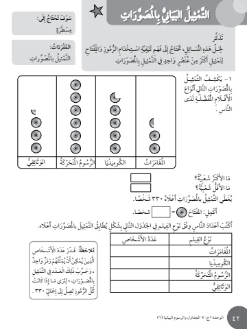 الوحدة 1ج: 7 الجداول والرسومالبيانية )1 )َ ْش َ �خ ِ اصة: َق ّ�دْر َ عَدَد اْألٌُ َالح َظمدِ ٌزَ واحٌْه ْم َ رمثَلُ يَمِّن أَ ْنُُِ ي ْمكُِ َ ينالذَِّ ِ يل الت ْمثِيف َِّ َك ْ الَع َ�دد �ر ْب َ ذلَِّ، و َجَِذ َ ا كَان ْتَ�ا إَى مَرتِِ ؛ لمل َص ّ�وَراتِا ُْبّ 330. ِ َْج ِالَِىل إل إِ ُِ َ تصُوزل ُّ الرمُكًَُّة؟ ِير َ ش ْعبثَُ ْكََا األمًَّة؟ ِيل َ ش ْعبََُّقَا األمه 330 َ ش ْخ ًصا. ِ أَ ْعَالُوَراتَّ بامل َصُيلِ ُيَغ ّط َّ ي الت ْمثُت َاح = ً شخصا.ِ ِل ْ : املفَأَ ْكمِ أَ ْعَاله. وَراتَّ بامل َصُِ َيل الت ْمثَّقُِ ي َطابَِش ْك ٍلَُّ ل الت ِال بَ ْدَوِيف اجلِيلم ِ ْفَقَ ن ْو ِع الفاد النَّ ِ اس وت ْب ْ أعَد َا ْكُُِ ِ يلمع الفَُ ْش َخ ِ اص َن ْود األَُعَدُ اتََراملَغامُِ ْيدياُ الكومةُرَكِّت َح املَُومُّ الرُس ُيُِّقِثائَ الوَُ اتاملَغام ا ََرَ ُة ِ ْيديُُ الكوم َكت َحّر املَُيُّومِ ُّ الرُس ُقِثائَ الوَُ ات:المْفَرَدُِوراتَّ بامل ّصُثيلالت ْم َُِّراتَوَّصامل َُِ بُِّانَيَيل البُِمثالت َّْكر ََّتَذت ِ احْفَِِ َ وا ْملُوزِ ْخَد ِام ُّ الرمِ ْ اس�تَّةيِْفَِىلَ ف ْهِم َ كيُاج إتِ ِل، َحتَِْ ا َْملَس�ائ�ل َ هذهَ ِِّحلِمل َصّوَراتِا ُِْ ِ يل ب الت ْمثٍ ِيف َِّ دٍ َ واحر عنْ ُُْنِثَر مِ ِ يل أَ ْكَت ْمثَِللى:َُِاج إتَسْو َفَ ت ْحٍَْس َطَرةِمي�لِ ُ الت ْمثَّ�فِ َُ ْكش1 -يْنَو َ اع الت ِال أَِ َّمل َصّوَراتِا ُْبِ َ لَدى ضَل�ةملَفََّْف َ�الِم ا ُْاْألالنَّ ِ اس .الوحدة 1ج: 7 الجداول والرسومالبيانية )1 )42َ ْش َ �خ ِ اصة: َق ّ�دْر َ عَدَد اْألٌُ َالح َظمدِ ٌزَ واحٌْه ْم َ رمثَلُ يَمِّن أَ ْنُُِ ي ْمكُِ َ ينالذَِّ ِ يل الت ْمثِيف َِّ َك ْ الَع َ�دد �ر ْب َ ذلَِّ، و َجَِذ َ ا كَان ْتَ�ا إَى مَرتِِ ؛ لمل َص ّ�وَراتِا ُْبّ 330. ِ َْج ِالَِىل إل إِ ُِ َ تصُوزل ُّ الرمُكًَُّة؟ ِير َ ش ْعبثَُ ْكََا األمًَّة؟ ِيل َ ش ْعبََُّقَا األمه 330 َ ش ْخ ًصا. ِ أَ ْعَالُوَراتَّ بامل َصُيلِ ُيَغ ّط َّ ي الت ْمثُت َاح = ً شخصا.ِ ِل ْ : املفَأَ ْكمِ أَ ْعَاله. وَراتَّ بامل َصُِ َيل الت ْمثَّقُِ ي َطابَِش ْك ٍلَُّ ل الت ِال بَ ْدَوِيف اجلِيلم ِ ْفَقَ ن ْو ِع الفاد النَّ ِ اس وت ْب ْ أعَد َا ْكُُِ ِ يلمع الفَُ ْش َخ ِ اص َن ْود األَُعَدُ اتََراملَغامُِ ْيدياُ الكومةُرَكِّت َح املَُومُّ الرُس ُيُِّقِثائَ الوَُ اتاملَغام ا ََرَ ُة ِ ْيديُُ الكوم َكت َحّر املَُيُّومِ ُّ الرُس ُقِثائَ الوَُ ات:المْفَرَدُِوراتَّ بامل ّصُثيلالت ْم َُِّراتَوَّصامل َُِ بُِّانَيَيل البُِمثالت َّْكر ََّتَذت ِ احْفَِِ َ وا ْملُوزِ ْخَد ِام ُّ الرمِ ْ اس�تَّةيِْفَِىلَ ف ْهِم َ كيُاج إتِ ِل، َحتَِْ ا َْملَس�ائ�ل َ هذهَ ِِّحلِمل َصّوَراتِا ُِْ ِ يل ب الت ْمثٍ ِيف َِّ دٍ َ واحر عنْ ُُْنِثَر مِ ِ يل أَ ْكَت ْمثَِللى:َُِاج إتَسْو َفَ ت ْحٍَْس َطَرةِمي�لِ ُ الت ْمثَّ�فِ َُ ْكش1 -يْنَو َ اع الت ِال أَِ َّمل َصّوَراتِا ُْبِ َ لَدى ضَل�ةملَفََّْف َ�الِم ا ُْاْألالنَّ ِ اس .الوحدة 1ج: 7 الجداول والرسومالبيانية )1 )42َ ْش َ �خ ِ اصة: َق ّ�دْر َ عَدَد اْألٌُ َالح َظمدِ ٌزَ واحٌْه ْم َ رمثَلُ يَمِّن أَ ْنُُِ ي ْمكُِ َ ينالذَِّ ِ يل الت ْمثِيف َِّ َك ْ الَع َ�دد �ر ْب َ ذلَِّ، و َجَِذ َ ا كَان ْتَ�ا إَى مَرتِِ ؛ لمل َص ّ�وَراتِا ُْبّ 330. ِ َْج ِالَِىل إل إِ ُِ َ تصُوزل ُّ الرمُكًَُّة؟ ِير َ ش ْعبثَُ ْكََا األمًَّة؟ ِيل َ ش ْعبََُّقَا األمه 330 َ ش ْخ ًصا. ِ أَ ْعَالُوَراتَّ بامل َصُيلِ ُيَغ ّط َّ ي الت ْمثُت َاح = ً شخصا.ِ ِل ْ : املفَأَ ْكمِ أَ ْعَاله. وَراتَّ بامل َصُِ َيل الت ْمثَّقُِ ي َطابَِش ْك ٍلَُّ ل الت ِال بَ ْدَوِيف اجلِيلم ِ ْفَقَ ن ْو ِع الفاد النَّ ِ اس وت ْب ْ أعَد َا ْكُُِ ِ يلمع الفَُ ْش َخ ِ اص َن ْود األَُعَدُ اتََراملَغامُِ ْيدياُ الكومةُرَكِّت َح املَُومُّ الرُس ُيُِّقِثائَ الوَُ اتاملَغام ا ََرَ ُة ِ ْيديُُ الكوم َكت َحّر املَُيُّومِ ُّ الرُس ُ