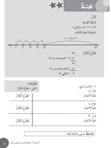 الوحدة 2أ: 9 نظام األعداد وخصائصالعدد 51ُاله.َلة أَ ْعِْثِن باألمتعة: ْ اسٌَُ َالح َظمَل ِ : َا ي1 - ْ احُس ْب م74 ÷ 4رُت َكّر املَُحُالطْرِ َّط ْ األعَدادَُّخ____________________________________________________98 ÷ 5رُت َكّر املَُحُالطْرِ َّط ْ األعَدادَُّخ____________________________________________________47 ÷ 3رُت َكّر املَُحُالطْرِ َّط ْ األعَدادَُّخ____________________________________________________٢ ff٢٢ fiff ٢ ff fi٢ffl − fflffi − ffi − ffi − ffi − ffifflfi −ffiُ ات:المْفَرَدُرت ّكرُ املَُحُي - الطْرِ ََّاقالبةُمَسِْالقكرََّتَذِْسَمةِق القَُِطَرائ72 ÷ 5 = 14 والباقي 2َِ ْعَدادِ ْخَد ُام َ خ ّط األْ استر 72ُت َكّر املَُحُالطْرَّ 50( 10 جمموعات من 5) 22 20( 4 جمموعات من 5) 2 ( الباقي 2)––الوحدة 2أ: 9 نظام األعداد وخصائصالعدد 51ُاله.َلة أَ ْعِْثِن باألمتعة: ْ اسٌَُ َالح َظمَل ِ : َا ي1 - ْ احُس ْب م74 ÷ 4رُت َكّر املَُحُالطْرِ َّط ْ األعَدادَُّخ____________________________________________________98 ÷ 5رُت َكّر املَُحُالطْرِ َّط ْ األعَدادَُّخ____________________________________________________47 ÷ 3رُت َكّر املَُحُالطْرِ َّط ْ األعَدادَُّخ____________________________________________________٢ ff٢٢ fiff ٢ ff fi٢ffl − fflffi − ffi − ffi − ffi − ffifflfi −ffiُ ات:المْفَرَدُرت ّكرُ املَُحُي - الطْرِ ََّاقالبةُمَسِْالقكرََّتَذِْسَمةِق القَُِطَرائ72 ÷ 5 = 14 والباقي 2َِ ْعَدادِ ْخَد ُام َ خ ّط األْ استر 72ُت َكّر املَُحُالطْرَّ 50( 10 جمموعات من 5) 22 20( 4 جمموعات من 5) 2 ( الباقي 2)––الوحدة 2أ: 9 نظام األعداد وخصائصالعدد ُاله.َلة أَ ْعِْثِن باألمتعة: ْ اسٌَُ َالح َظمَل ِ : َا ي1 - ْ احُس ْب م74 ÷ 4رُت َكّر املَُحُالطْرِ َّط ْ األعَدادَُّخ____________________________________________________98 ÷ 5رُت َكّر املَُحُالطْرِ َّط ْ األعَدادَُّخ____________________________________________________47 ÷ 3رُت َكّر املَُحُالطْرِ َّط ْ األعَدادَُّخ____________________________________________________٢ ff٢٢ fiff ٢ ff fi٢ffl − fflffi − ffi − ffi − ffi − ffifflfi −ffiُ ات:المْفَرَدُرت ّكرُ املَُحُي - الطْرِ ََّاقالبةُمَسِْالقكرََّتَذِْسَمةِق القَُِطَرائ72 ÷ 5 = 14 والباقي 2َِ ْعَدادِ ْخَد ُام َ خ ّط األْ استر 72ُت َكّر املَُحُالطْرَّ 50( 10 جمموعات من 5) 22 20( 4 جمموعات من 5) 2 ( الباقي 2)––الوحدة 2أ: 9 نظام األعداد وخصائصالعدد ُاله.َلة أَ ْعِْثِن باألمتعة: ْ اسٌَُ َالح َظمَل ِ : َا ي1 - ْ احُس ْب م74 ÷ 4رُت َكّر املَُحُالطْرِ َّط ْ األعَدادَُّخ____________________________________________________98 ÷ 5رُت َكّر املَُحُالطْرِ َّط ْ األعَدادَُّخ____________________________________________________47 ÷ 3رُت َكّر املَُحُالطْرِ َّط ْ األعَدادَُّخ____________________________________________________٢ ff٢٢ fiff ٢ ff fi٢ffl − fflffi − ffi − ffi − ffi − ffifflfi −ffiُ ات:المْفَرَدُرت ّكرُ املَُحُي - الطْرِ ََّاقالبةُمَسِْالقكرََّتَذِْسَمةِق القَُِطَرائ72 ÷ 5 = 14 والباقي 2َِ ْعَدادِ ْخَد ُام َ خ ّط األْ استر 72ُت َكّر املَُحُالطْرَّ 50( 10 جمموعات من 5) 22 20( 4 جمموعات من 5) 2 ( الباقي 2)––الوحدة 2أ: 9 نظام األعداد وخصائصالعدد 51ُاله.َلة أَ ْعِْثِن باألمتعة: ْ اسٌَُ َالح َظمَل ِ : َا ي1 - ْ احُس ْب م74 ÷ 4رُت َكّر املَُحُالطْرِ َّط ْ األعَدادَُّخ____________________________________________________98 ÷ 5رُت َكّر املَُحُالطْرِ َّط ْ األعَدادَُّخ____________________________________________________47 ÷ 3رُت َكّر املَُحُالطْرِ َّط ْ األعَدادَُّخ____________________________________________________٢ ff٢٢ fiff ٢ ff fi٢ffl − fflffi − ffi − ffi − ffi − ffifflfi −ffiُ ات:المْفَرَدُرت ّكرُ املَُحُي - الطْرِ ََّاقالبةُمَسِْالقكرََّتَذِْسَمةِق القَُِطَرائ72 ÷ 5 = 14 والباقي 2َِ ْعَدادِ ْخَد ُام َ خ ّط األْ استر 72ُت َكّر املَُحُالطْرَّ 50( 10 جمموعات من 5) 22 20( 4 جمموعات من 5) 2 ( الباقي 2)––الوحدة 2أ: 9 نظام األعداد وخصائصالعدد ُاله.َلة أَ ْعِْثِن باألمتعة: ْ اسٌَُ َالح َظمَل ِ : َا ي1 - ْ احُس ْب م74 ÷ 4رُت َكّر املَُحُالطْرِ َّط ْ األعَدادَُّخ____________________________________________________98 ÷ 5رُت َكّر املَُحُالطْرِ َّط ْ األعَدادَُّخ____________________________________________________47 ÷ 3رُت َكّر املَُحُالطْرِ َّط ْ األعَدادَُّخ____________________________________________________٢ ff٢٢ fiff ٢ ff fi٢ffl − ffl