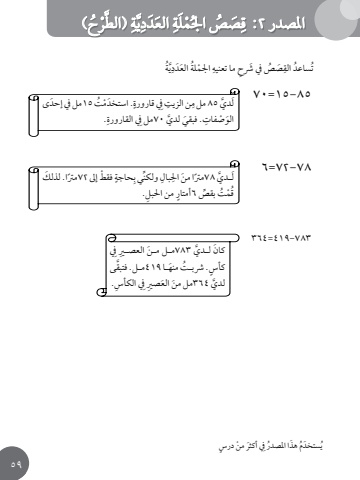 59ح(ُر )الطََِّّْةيِدد العََِلةَمُ ْص اجلُصَِاملصدر 2 :قم َ هذ ُ ا املصدرِيف َ أكثر ْ من ٍ درسي َ ستخدُُةَُّيِ العَددلة َُ اجلمِ ْص يف َرشِح ما تعنيهَُصُِ ساعد القتُت15 َ مل يف إحدى ْ ٍُ َ . استخدمِ ِيف قارورةِن الزيتدي85 مل مل ََّ.ِِيف القارورةِ َ . فبقي َّ لدي 70مل َ الو ْصفات85-15=70ٍ ْ فقط إىل 72ً مرت َ ا. لذلكِحاجةي بِ ولكنِِّ بال�دي78ً مرت َ ا من احلل ٍََّ ِ من احلبل.ِّ بقص6أمتارتق ْم ُُ78-72=6�ريِيفَ كان َّ ل�دي 783 َ م�ل م�ن العص ِم�ل. فتبقى َّ. رشب�ت َ منه�ا 419ٍ كأس ُ الع ِصريِيف ِ الكأس.َّ لدي 364 َ مل من َ783-419=3649ح(ُر )الطََِّّْةيِدد العََِلةَمُ ْص اجلُصَِاملصدر 2 :قم َ هذ ُ ا املصدرِيف َ أكثر ْ من ٍ درسي َ ستخدُُةَُّيِ العَددلة َُ اجلمِ ْص يف َرشِح ما تعنيهَُصُِ ساعد القتُت15 َ مل يف إحدى ْ ٍُ َ . استخدمِ ِيف قارورةِن الزيتدي85 مل مل ََّ.ِِيف القارورةِ َ . فبقي َّ لدي 70مل َ الو ْصفات85-15=70ٍ ْ فقط إىل 72ً مرت َ ا. لذلكِحاجةي بِ ولكنِِّ بال�دي78ً مرت َ ا من احلل ٍََّ ِ من احلبل.ِّ بقص6أمتارتق ْم ُُ78-72=6�ريِيفَ كان َّ ل�دي 783 َ م�ل م�ن العص ِم�ل. فتبقى َّ. رشب�ت َ منه�ا 419ٍ كأس ُ الع ِصريِيف ِ الكأس.َّ لدي 364 َ مل من َ783-419=3649ح(ُر )الطََِّّْةيِدد العََِلةَمُ ْص اجلُصَِاملصدر 2 :قم َ هذ ُ ا املصدرِيف َ أكثر ْ من ٍ درسي َ ستخدُُةَُّيِ العَددلة َُ اجلمِ ْص يف َرشِح ما تعنيهَُصُِ ساعد القتُت15 َ مل يف إحدى ْ ٍُ َ . استخدمِ ِيف قارورةِن الزيتدي85 مل مل ََّ.ِِيف القارورةِ َ . فبقي َّ لدي 70مل َ الو ْصفات85-15=70ٍ ْ فقط إىل 72ً مرت َ ا. لذلكِحاجةي بِ ولكنِِّ بال�دي78ً مرت َ ا من احلل ٍََّ ِ من احلبل.ِّ بقص6أمتارتق ْم ُُ78-72=6�ريِيفَ كان َّ ل�دي 783 َ م�ل م�ن العص ِم�ل. فتبقى َّ. رشب�ت َ منه�ا 419ٍ كأس ُ الع ِصريِيف ِ الكأس.َّ لدي 364 َ مل من َ783-419=36459ح(ُر )الطََِّّْةيِدد العََِلةَمُ ْص اجلُصَِاملصدر 2 :قم َ هذ ُ ا املصدرِيف َ أكثر ْ من ٍ درسي َ ستخدُُةَُّيِ العَددلة َُ اجلمِ ْص يف َرشِح ما تعنيهَُصُِ ساعد القتُت15 َ مل يف إحدى ْ ٍُ َ . استخدمِ ِيف قارورةِن الزيتدي85 مل مل ََّ.ِِيف القارورةِ َ . فبقي َّ لدي 70مل َ الو ْصفات85-15=70ٍ ْ فقط إىل 72ً مرت َ ا. لذلكِحاجةي بِ ولكنِِّ بال�دي78ً مرت َ ا من احلل ٍََّ ِ من احلبل.ِّ بقص6أمتارتق ْم ُُ78-72=6�ريِيفَ كان َّ ل�دي 783 َ م�ل م�ن العص ِم�ل. فتبقى َّ. رشب�ت َ منه�ا 419ٍ كأس ُ الع ِصريِيف ِ الكأس.َّ لدي 364 َ مل من َ783-419=364ح(ُر )الطََِّّْةيِدد العََِلةَمُ ْص اجلُصَِاملصدر 2 :قم َ هذ ُ ا املصدرِيف َ أكثر ْ من ٍ درسي َ ستخدُُةَُّيِ العَددلة َُ اجلمِ ْص يف َرشِح ما تعنيهَُصُِ ساعد القتُت15 َ مل يف إحدى ْ ٍُ َ . استخدمِ ِيف قارورةِن الزيتدي85 مل مل ََّ.ِِيف القارورةِ َ . فبقي َّ لدي 70مل َ الو ْصفات85-15=70ٍ ْ فقط إىل 72ً مرت َ ا. لذلكِحاجةي بِ ولكنِِّ بال�دي78ً مرت َ ا من احلل ٍََّ ِ من احلبل.ِّ بقص6أمتارتق ْم ُُ78-72=6�ريِيفَ كان َّ ل�دي 783 َ م�ل م�ن العص ِم�ل. فتبقى َّ. رشب�ت َ منه�ا 419ٍ كأس ُ الع ِصريِيف ِ الكأس.َّ لدي 364 َ مل من َ783-419=364ح(ُر )الطََِّّْةيِدد العََِلةَمُ ْص اجلُصَِاملصدر 2 :قم َ هذ ُ ا املصدرِيف َ أكثر ْ من ٍ درسي َ ستخدُُةَُّيِ العَددلة َُ اجلمِ ْص يف َرشِح ما تعنيهَُصُِ ساعد القتُت15 َ مل يف إحدى ْ ٍُ َ . استخدمِ ِيف قارورةِن الزيتدي85 مل مل ََّ.ِِيف القارورةِ َ . فبقي َّ لدي 70مل َ الو ْصفات85-15=70ٍ ْ فقط إىل 72ً مرت َ ا. لذلكِحاجةي بِ ولكنِِّ بال�دي78ً مرت َ ا من احلل ٍََّ ِ من احلبل.ِّ بقص6أمتارتق ْم ُُ78-72=6�ريِيفَ كان َّ ل�دي 783 َ م�ل م�ن العص ِم�ل. فتبقى َّ. رشب�ت َ منه�ا 419ٍ كأس ُ الع ِصريِيف ِ الكأس.َّ لدي 364 َ مل من َ783-419=36459ح(ُر )الطََِّّْةيِدد العََِلةَمُ ْص اجلُصَِاملصدر 2 :قم َ هذ ُ ا املصدرِيف َ أكثر ْ من ٍ درسي َ ستخدُُةَُّيِ العَددلة َُ اجلمِ ْص يف َرشِح ما تعنيهَُصُِ ساعد القتُت15 َ مل يف إحدى ْ ٍُ َ . استخدمِ ِيف قارورةِن الزيتدي85 مل مل ََّ.ِِيف القارورةِ َ . فبقي َّ لدي 70مل َ الو ْصفات85-15=70ٍ ْ فقط إىل 72ً مرت َ ا