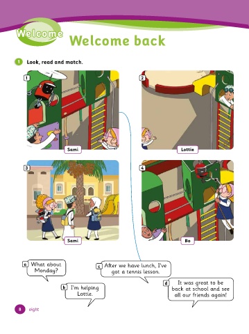 Welcomeome W elc Welcome back 1 Look, read and match. 1 2 Sami Lottie 3 4 Sami Bo a What about c A�ter we have lunch, I’ve Monday? got a tennis lesson. d It was great to be b I’m helping bac� at school and see Lottie. all our �riends again! 8 eight
