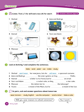 1 3.5 Listen. Tick (✓) for will and cross (✘) for won’t. Grammar reference, page 46