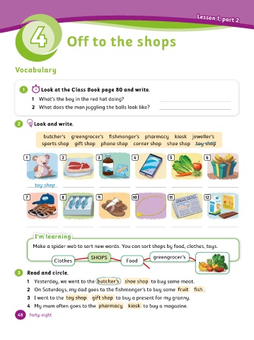 Make a spider web to sort new words. You can sort shops by food, clothes, toys.