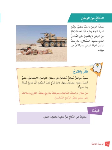 98 َ الو ْح ُدة ُ الثالثةك ِّ في الد ِفاع ْ عن ِ وطن ِ نا بالقول ِ والعمل.ُن�ش ِارُ قيمناؤد ِيهِّ يٌّحماية ِ الوطن ٌ واجب وطنيًُّ ِّ ا له؛ فالد ُفاعه حبُ الفرد َ اتجاه ِ وطن ُُ على الج ِّ نديرِعن ِ الوطن ال ِ يقت�صُ يمتدَ ْ ��ل ُّ�ل ال���سِّ �لاَح، بُِ ال��ذي ي�ح�مل ِ من ٌّلي�ش َمل َ أفراد ِ الوطن ً جميع َ ا كِ موقعه.ُفاع ِ عن َ الوط ِنالدِّفك ْر ْ واقترحِّتفاعل ِ في و�سائل التوا�صِل اال ِّ جتماعي ُ ، يتابعٌ مٌّ ُ عمانيٌ مواطن ُ�سعيدٌ ع َمانن َ تاريخ ََُّرٍة َ كتب ُ أحدهم أَّ مه ويتفاعل َ معها، ذات ََُ أخبار ِ وطنَ ً حديثا.بدأَ َكَّ ِ ابقة ِ ، ومعرفت َك ِ بتاريخ ِ وطن َك ِ ، اقترْح وزمالءِ من خالل ِ درا�ست َك ال�س الم ِ نا�سبة. ُُّ الر ِ دودٍ على �سعيد بع�َض