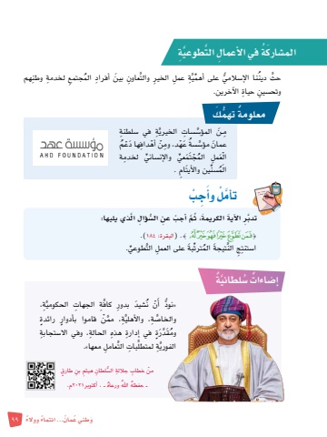 َو ُ طني ع 99ُ مان ٌ ... انتماء ٌ ووالء الم ِ جتمع ِ لخدمة ِ وطنهم َّ ِة ِ عمل ِ الخير َّ والت ِ عاون َ بين ِ أفراد ُأهميُّ على ِّ ديننا الإ�سالميُحثَِّ وتح�سين ِ حياة الآخرين. الت َّ طوعيِةة ِ في الأعمال َُّالم�ش َ اركَّ ِة ِ في �سلطنةَّ ِ �سات الخيريِم َ �ن المؤ�سمُ�سة َ عْه ِ د، ومْن ْ أه ِداف َ ها دْعَّ َُ عمان مؤ�سِّ والإن�ساني ِ لخدمة عيِّ المْجَتَمْالَع ِمل ُ�سن َ ين والأيت ِام . ِّمَالُ تهم َكمعلومة ٌُّ{ ڈڈژژڑ ڑ }. )البقرة: 184 .)َ ِج ْبَّت�أم ْل و�أترت َبة ِ على العمل َّ الت ِّ طوعي. الم ِّ الن َ تيجة َُِّ ا�ستنت ِجَّ تدبِر َ الآية َ الكريمة ُ ، ثَّم ْ أجب ِ عن ال�سُّ ِ ؤال َّ الذي يليها:ةٌَّ لطاني �ساءات ٌُإ�ضَّ ِة، ن�ش َيد ِ بدور ِ كافَّة ِ الجهات الحكوميُْنَُّ »نود أ، ممْن قاموا ب ٍ أدوار ٍ رائدةَّ ِة َّوالخا�صَّ ِة، والأهليدَرٍة في ِ إدارة ِ هذه ِ الحالة، وفي اال ِ �ستجابةَّومَقُ لمتطل ِ بات َّ الت ِ عامل معها«.ََّّ ِةالفوريُّ ِ لطان ِ هيثم ِ بن ٍ طارقْمن ِ خطاب ِ جاللة ال�ســ ُ حفظه ُ اهلل ُ ورعاه ــ ، أكتوبر2021م.