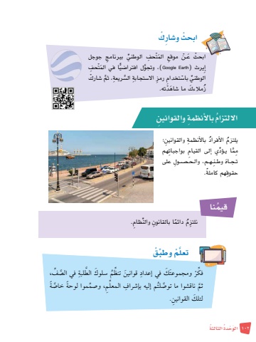 102 َ الو ْح ُدة ُ الثالثةْ ابحث و�ش ِار ْك المْت ِحف ِّ الوطني ِ ببرنامج جوجل ْ ابحث َ ع ْ �ن ِ موقع ًَّ َ ا في المْت ِحفَّل افترا�ضيإِيرث )Earth Google ،)وتجوَّ ِ ريعة َّ ، ثم �ش ْ اركْ ِ تخدام ِ رمز اال ِ �ستجابة ال�سِّ الوطني با�سز َ مالءك ما �ش َاهْدته. ُُ يلتزم ُ الأفراد ِ بالأنظمة ِ والقوانين؛ ؤدي ِ إلى القيام ِ بواجباتهم ما ي� َِِّّمَ ت�ج�اه ِ وط�ن�ه�م، وال�ح���ص ِ �ول على ِ حقوق ً هم كاملة.اال ُ لتزام ِ بالأنظمة ِ والقوانين والن ِظام.ِّ دائم ِ ا بالقانونم ًِ نلتزُُ قيمناف، ِِّ َّ في الص الطلبةَُّ َ سلوك تنظمِِّ َ قوانينْ َ ومجموعت َك في إعدادفكرِّ، وصم ً موا لوحة َّ خاصًةِِّّ ِمَّ َّ ناقشوا ما توص ُلت ِ م إليه بإشراف المعلثمَ لتلك ِ القوانين.ِّ وطب ْقتعل ْمَّ