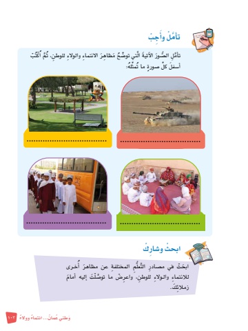 َو ُ طني ع 103ُ مان ٌ ... انتماء ٌ ووالءت ْبُ اْكُم، ث َُّ م ِظاهَر اال ِ نتماء والوالِء ِ للوطنح َتي تو�ضُ ال ِّأمِل ال�صُّ َور َ الآتية َّت َّله:ُمثُِّ ما ت كل �ص ٍ ورةَ أ�سفل َِّ ِج ْبَّ أمْل وأت............................................................................................................................................ْ ابحث و�ش ِار ْكخ�رى ُُِّم ِ المختلفة َ عن مظاهر أَ ابح ْث في م�ص ِ ادر َّ التعلِ لالنتماء وال�والِء ِ للوطن ِ ، واعر�ْض ما تو�صَّ ْل َت إليه َ أمامِ زمالئ َك.