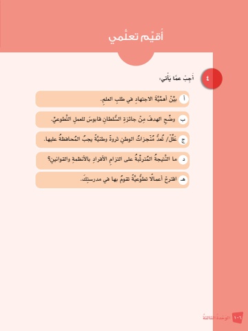ْ 4 تي: عم َ ا يأَ ِج ْب َّأَّ َة اال ِ جتهاد ِ في طلب ِ العلم.أهميِِّّ ْنأ بيَّ الت ِّ طوعي.َس ِ للعملُّ ِ لطان قابو� و�ض ِح َ الهدف ِ مْن ِ جائزة ال�سِّبحافظة عليها.ُ المُ يجبَّ ًة ُ مْن ُ جزات ِ الوطن ً ثروة وطنيُعد/ ت ُُّلْلِّج َعبة ِ على التزام ِ الأفراد ِ بالأنظمة ِ والقوانين؟ُترت الم ِّتيجة ُُما النَّدَّ ًة ُ تقوم ِ بها في مدر�ست َك.عيُّهـ ْ اقترح ً أعمال تطوم تعلميُُّ ِّقيأ106 َ الو ْح ُدة ُ الثالثة