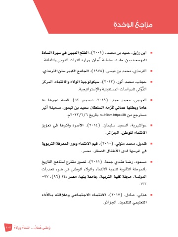 َو ُ طني ع 107ُ مان ٌ ... انتماء ٌ ووالءn ابن رزيق، حميد بن محمد. )2001 .)الفتح المبين في �سيرة ال�سادة ُ . �سلطنة عمان: وزارة التراث القومي والثقافة. البو�سعيديين. ط ٥n الترمذي، محمد بن عي�سى. )1978 .)الجامع الكبير �سنن الترمذي.n حجاب، محمد أنور. )2013� .)سيكولوجية الوالء واالنتماء. المركز ْلي للدرا�سات الم�ستقبلية والإ�ستراتيجية.َّ الدوn العريمي، محمد حمد. )2019 ،دي�سمبر 13 .)ق�صة عمرها 80َ عاما وبطلها عماني كَّرمه ال�سلطان �سعيد بن تيمور. �صحيفة أثير م�سترجع من l8://https.rBbm/nu بتاريخ 6/6/2023م.n عوا�شيرية، ال�سعيد �سليمان. )2014 .)الأ�سرة وأثرها في تعزيز االنتماء للوطن. الجزائر.n قنديل، محمد متولي. )2010 .)قيم االنتماء ودور المعرفة التربوية في غر�سها لدى الأطفال ال�صغار. م�صر.n م�سـعود، ر�ضـا هنـدي جمعة. )2011 .)ت�صور مقترح لمناهج التاريخ بالمرحلة الثانوية لتنمية االنتماء والوالء الوطني في �ضوء تحديات العـولمـة. مـجلة كليـة التربيـة، جامعة بنهـا، م�صر ،24( 96 ،)97-133.n هذلي، ع��ادل. )2017 .)االنتماء االجتماعي وعلاقته ب الأداء التعليمي للتلميذ. الجزائر.َمر ِ اج ُع َ الو ْح ِدة